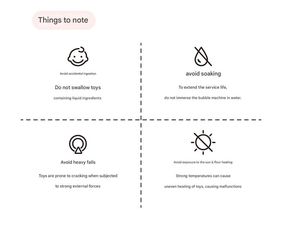 This product contains a lithium battery. Please do not aim at eyes or face during use or charging, and do not direct bubbles into eyes. Adult supervision is recommended for young children. Use only the manufacturer-recommended bubble solution for best results and to maintain product integrity. Do not mix old and new batteries or different types of batteries if using disposable battery option (though this model specifies rechargeable). Ensure the battery compartment is securely closed. Do not immerse the entire machine in water, though it is designed to be leak-resistant from the solution bottle. This toy is intended for outdoor use or in well-ventilated areas. Ensure the toy is appropriate for the child's age. This product is a toy and may not meet Australian standards for unsupervised child play without adult guidance; parental discretion is advised.