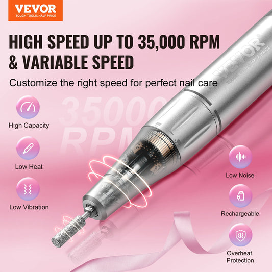 Product Features High Speed Up To 35,000RPM & Variable Speed Control VEVOR electric cordless nail drill features a high-efficiency motor, reaching high speed of up to 35,000RPM, ensuring smooth nail...