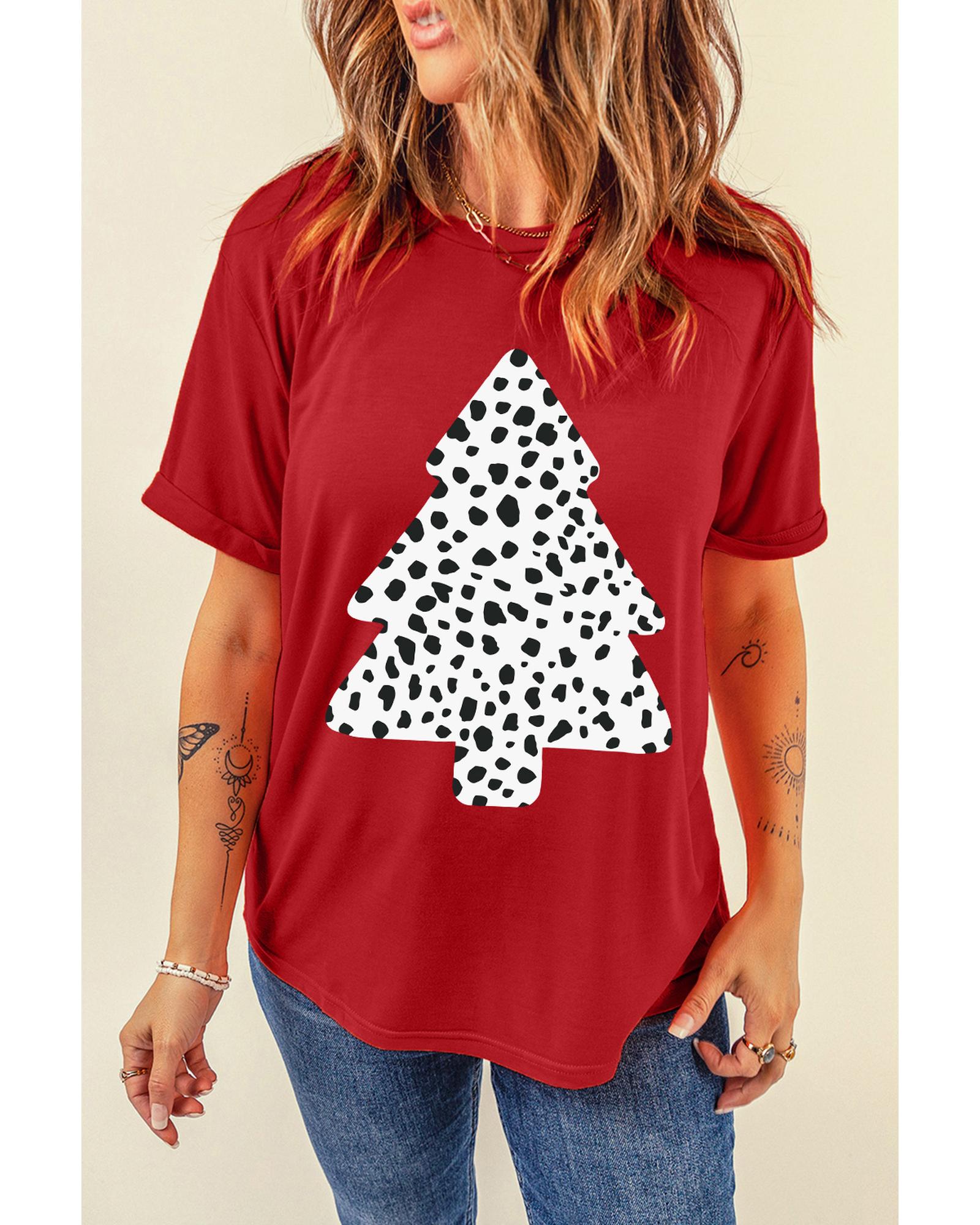 • Womens Leopard Christmas Tree Print Short Sleeve Graphic Tee