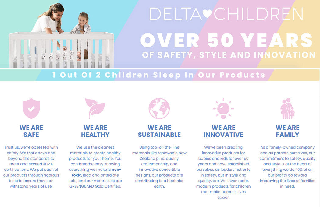 Delta Children was founded around the idea of making safe, high-quality children’s furniture affordable for all families. They know there’s nothing more important than safety when it comes to your child’s space. That’s why all Delta Children products are built with long-lasting materials to ensure they stand up to years of jumping and playing. Plus, they are rigorously tested to meet or exceed all industry safety standards.