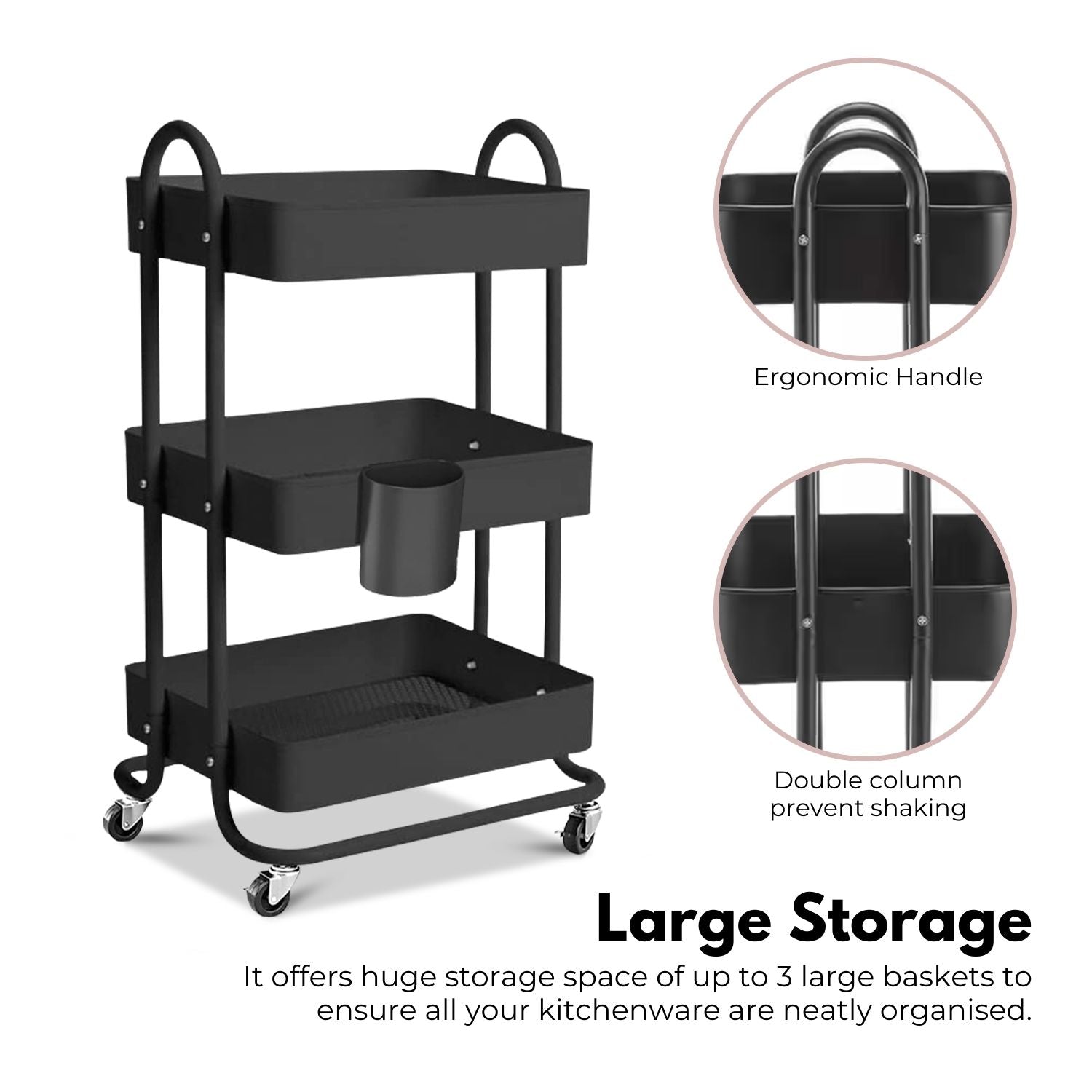 Large Storage Capacity It offers huge storage space of up to 3 large baskets to ensure all your kitchenware are neatly organized.