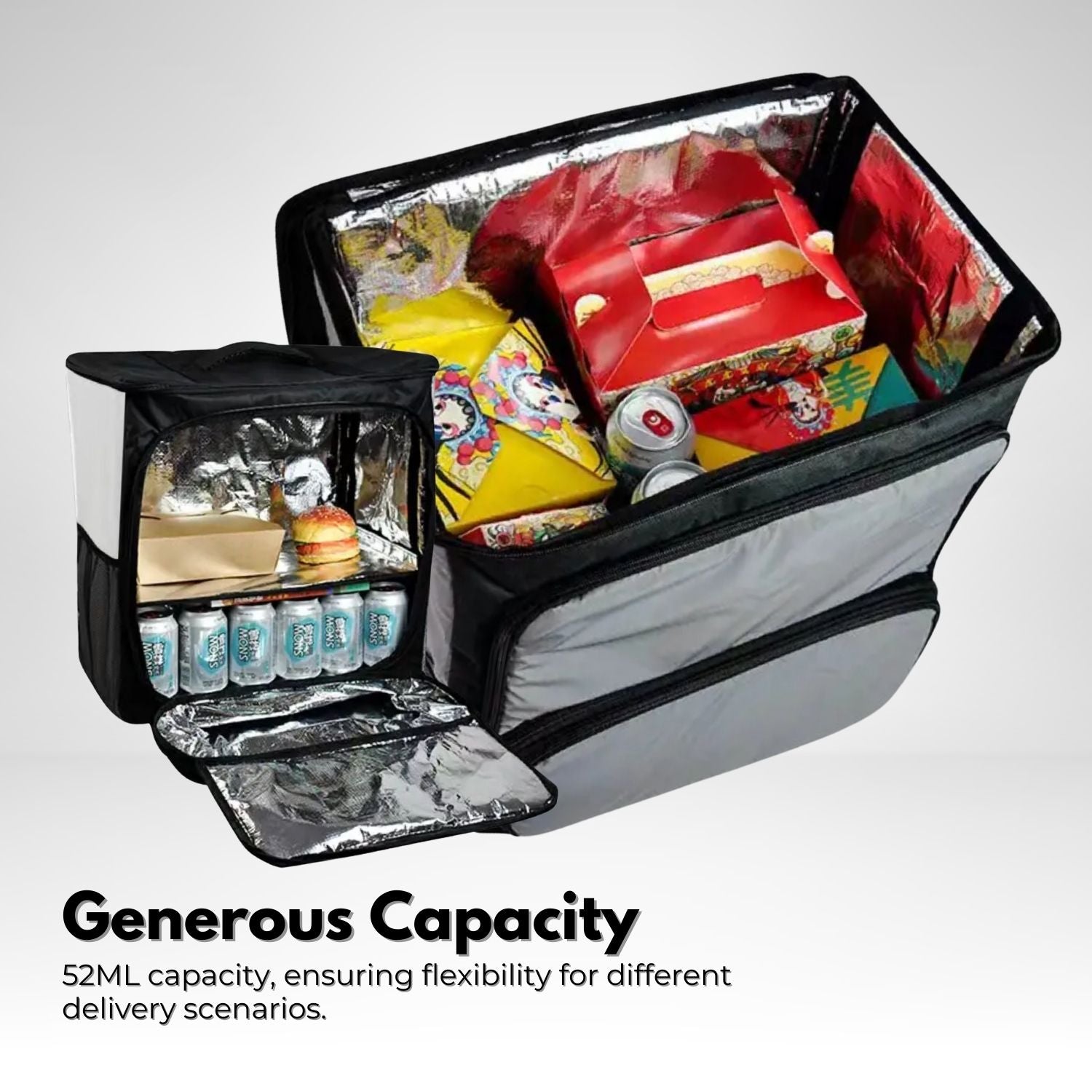 Waterproof and Stylish: Featuring a sleek Black Grey color, the Oxford Cloth and Reflective Cloth construction not only offers waterproof protection for your deliveries but also adds a touch of elegance.