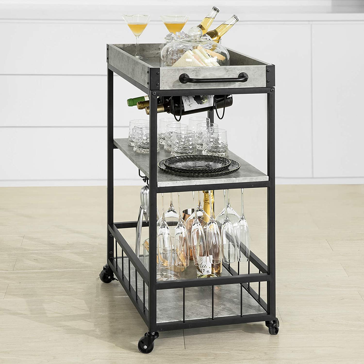 Industrial Vintage Style Wood Metal 3 Tiers Kitchen Serving Trolley with Wine Rack (Grey)